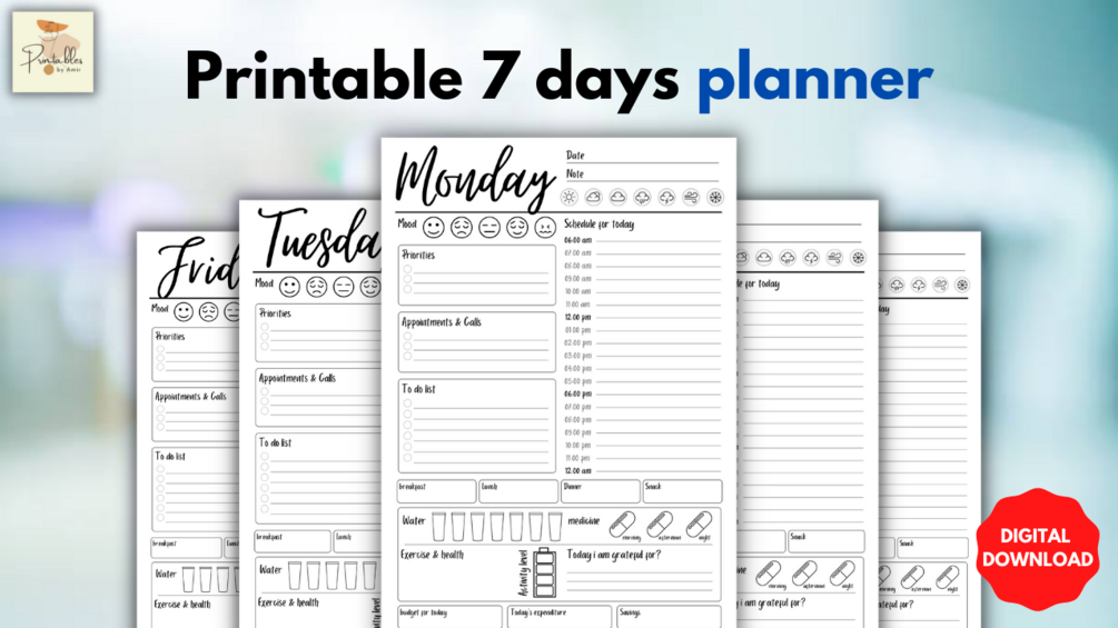 • This “Printable 7 days’ planner” package includes 7 high resolution PDF pages you can instantly download along with printing instructions.
